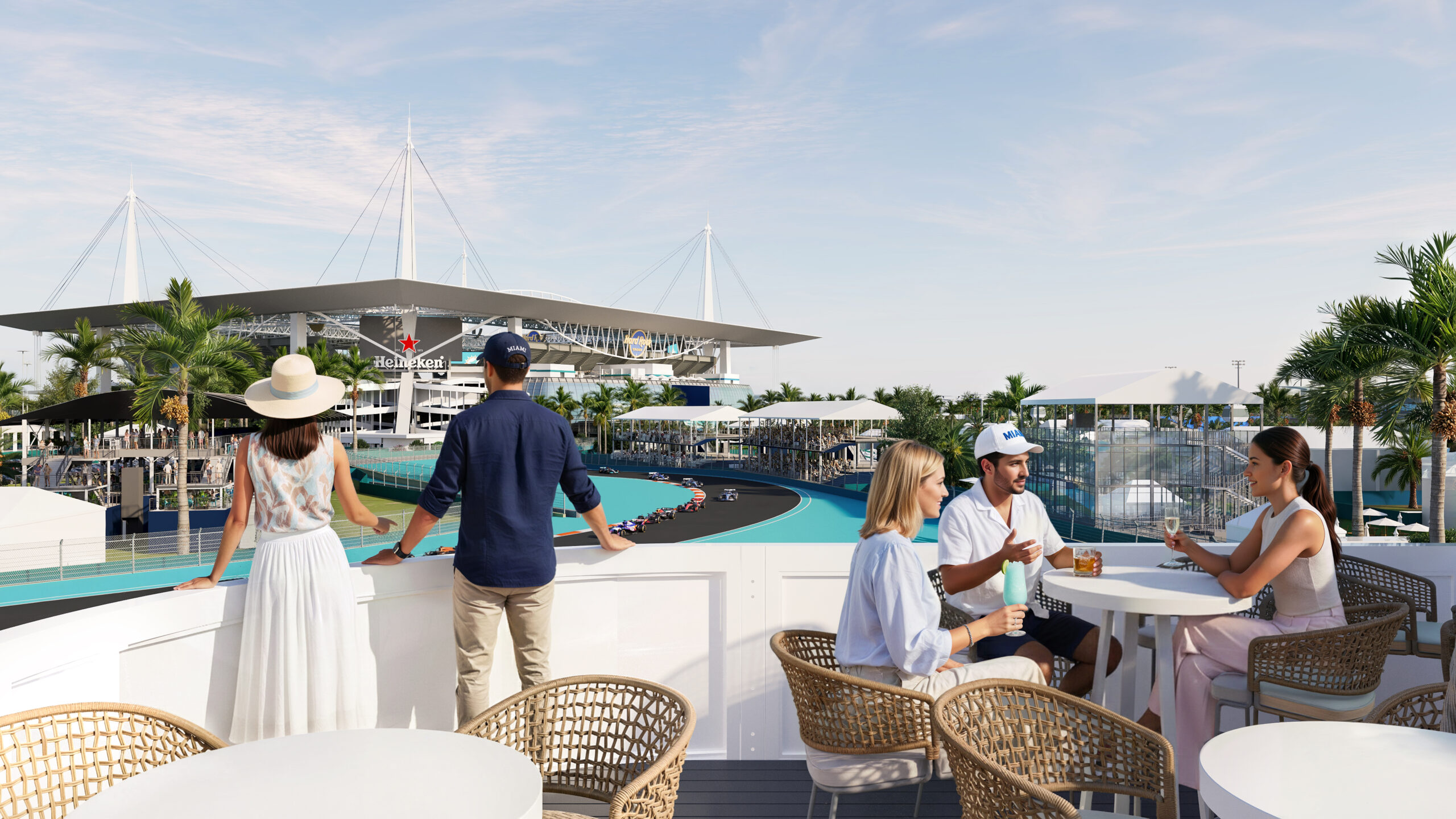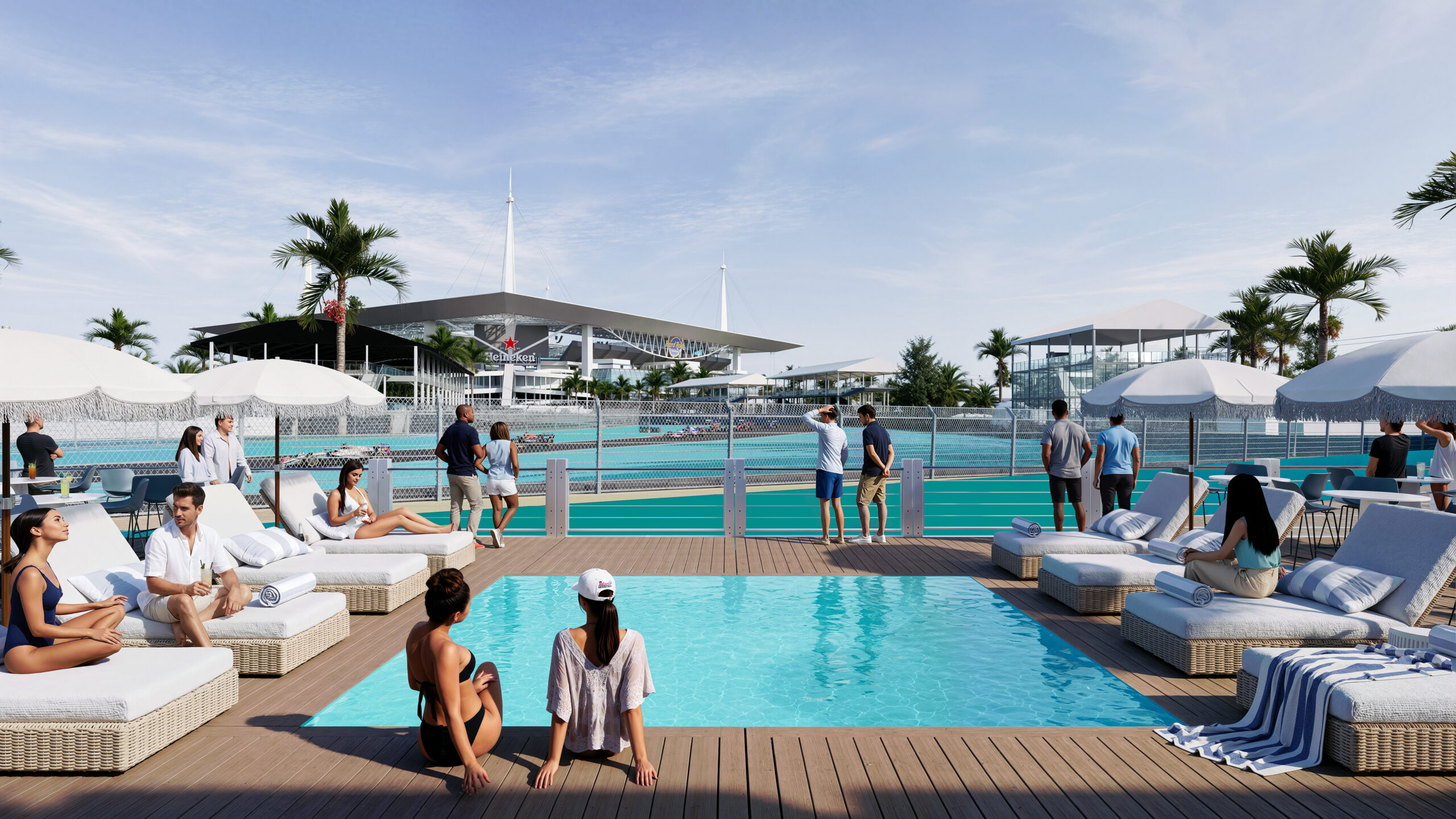 El diseño combina lujo contemporáneo y funcionalidad: terrazas al aire libre, áreas sombreadas, lounges, plataformas de observación y piscinas que permiten disfrutar del evento sin perder detalle de la acción en pista.