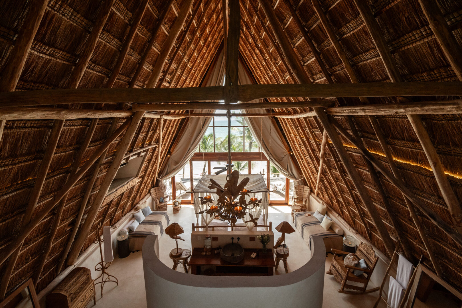 Desde su concepción, La Valise fue pensada como algo más que un hotel. El diseño rinde homenaje a la artesanía maya, elevando materiales locales como el chukum y reinterpretando las tradicionales palapas en clave sofisticada. Cada lámpara tejida, cada textura orgánica, cada pieza de mobiliario parece elegida con la intención de contar una historia. El resultado es una estética que oscila entre museo íntimo y refugio bohemio frente al mar.